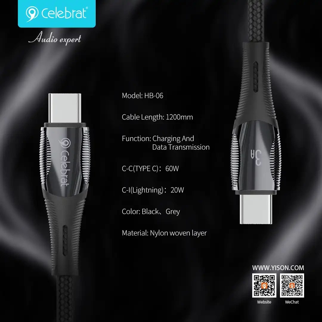 کابل انتقال دیتا و شارژ تایپ سی به تایپ سی 1.2متری سلبریت مدل Celebrat HB-06 توان 60وات با آلیاژ روی