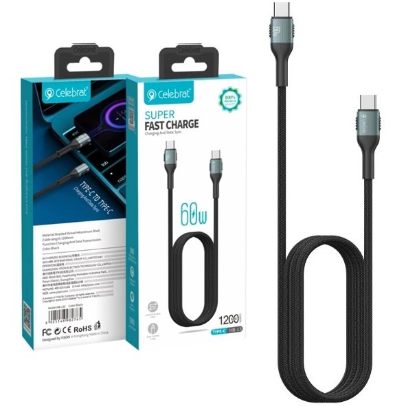 کابل انتقال دیتا و شارژ تایپ سی به تایپ سی C TO C سلبریت مدل Celebrat HB-13توان 60 وات گارانتی یکساله زودبیار